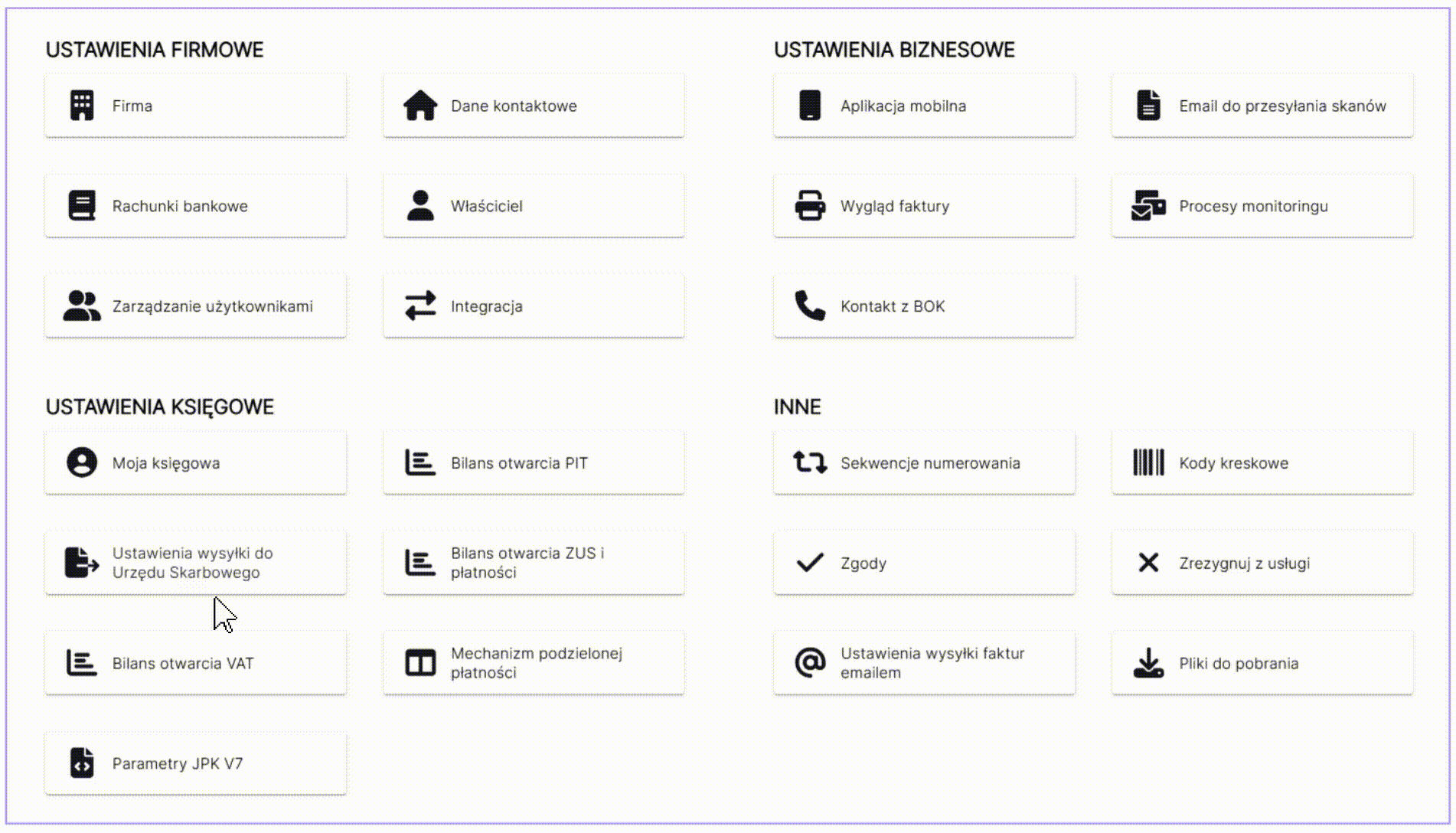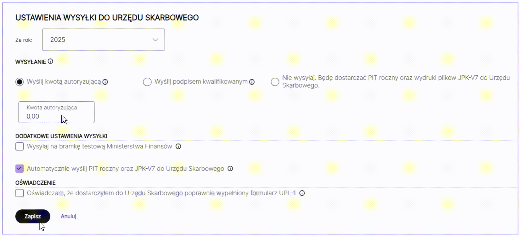 1. Przejść do zakładki Ustawienia/Ustawienia wysyłki do Urzędu Skarbowego;