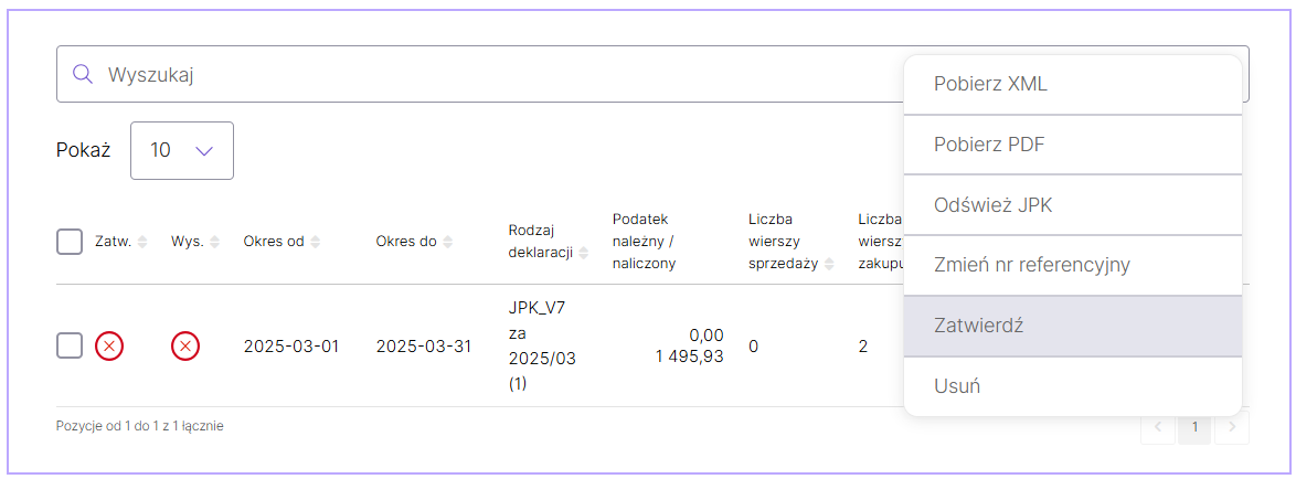 Przed wysłaniem pliku JPK konieczne jest jego wcześniejsze zatwierdzenie. W celu zatwierdzenia należy skierować kursor na trzy kropki przy dokumencie i wybrać opcję Zatwierdź.