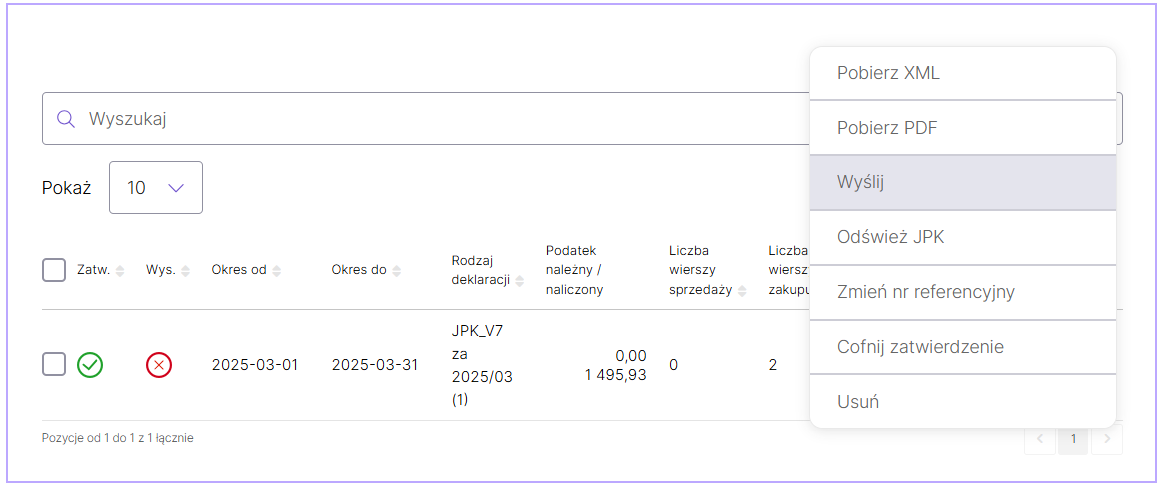 Na zatwierdzonym pliku JPK_V7 pojawi się przycisk Wyślij, który należy wybrać, aby plik został wysłany kwotą do autoryzacji eDeklaracji.