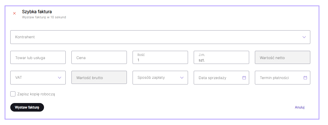 Szybka faktura to udogodnienie, które pozwala na wystawienie faktury w trzech szybkich krokach. Można to zrobić bezpośrednio z Pulpitu, czyli pierwszej zakładki widocznej po zalogowaniu się do systemu, bez konieczności przechodzenia do zakładki Fakturowanie/Faktury. Należy wówczas kliknąć na wskazaną ikonę, która znajduje się po prawej stronie funkcji Szybka faktura.