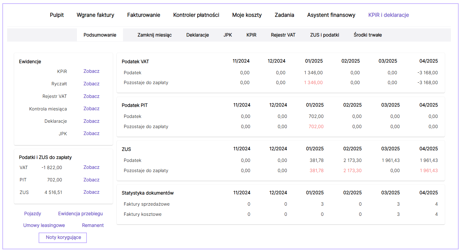 Wystawione noty korygujące do faktur kosztowych widoczne są w zakładce KPiR i deklaracje/Podsumowanie/ Noty korygujące: