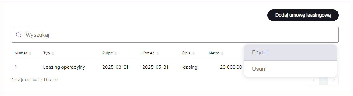 2. Skierować kursor na trzy kropki przy umowie leasingowej i wybrać przycisk Edytuj;