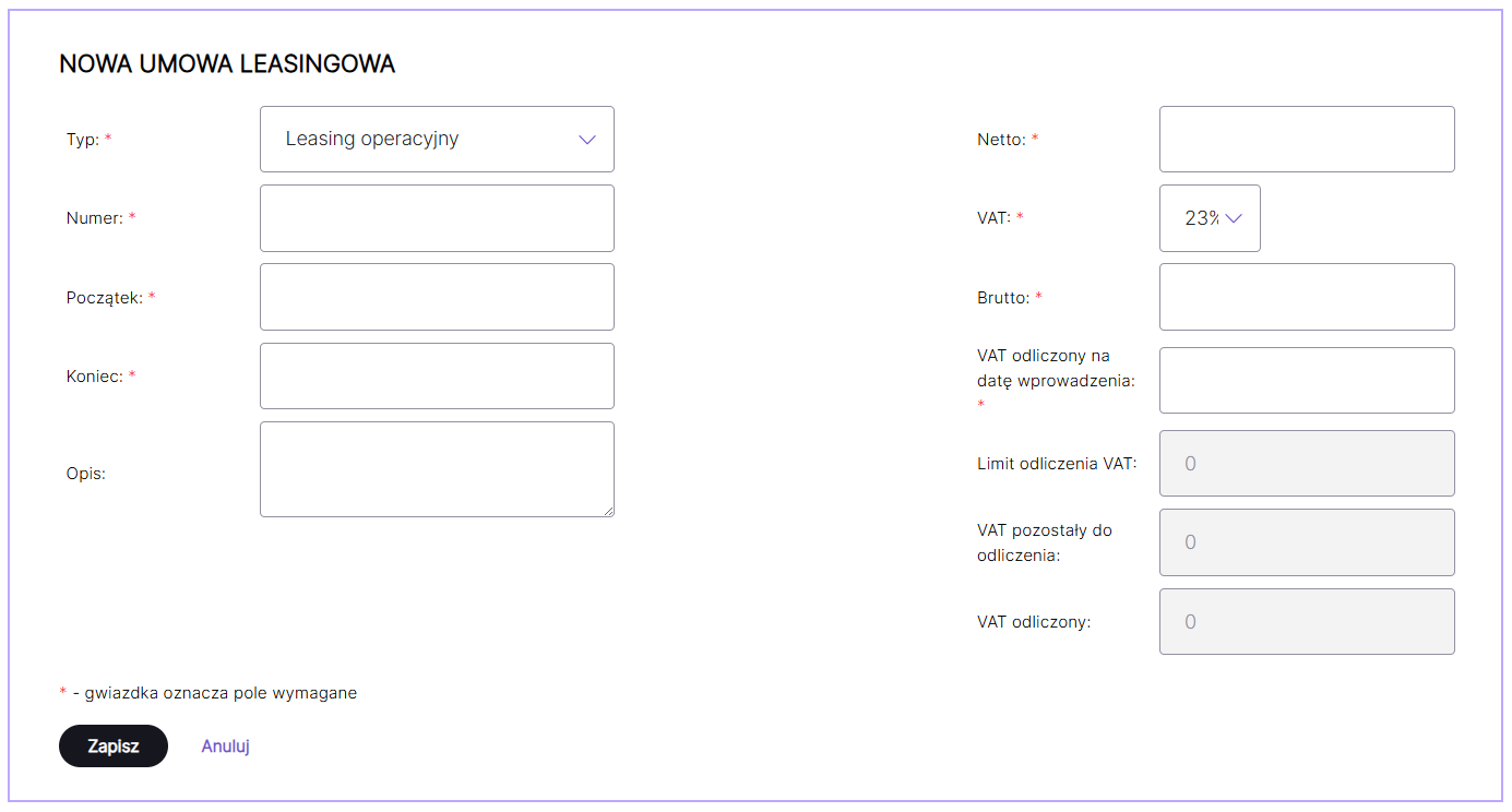 Wyświetli się wówczas formularz, który należy uzupełnić zgodnie z danymi zawartymi na wprowadzanej umowie i zatwierdzić przyciskiem Zapisz: