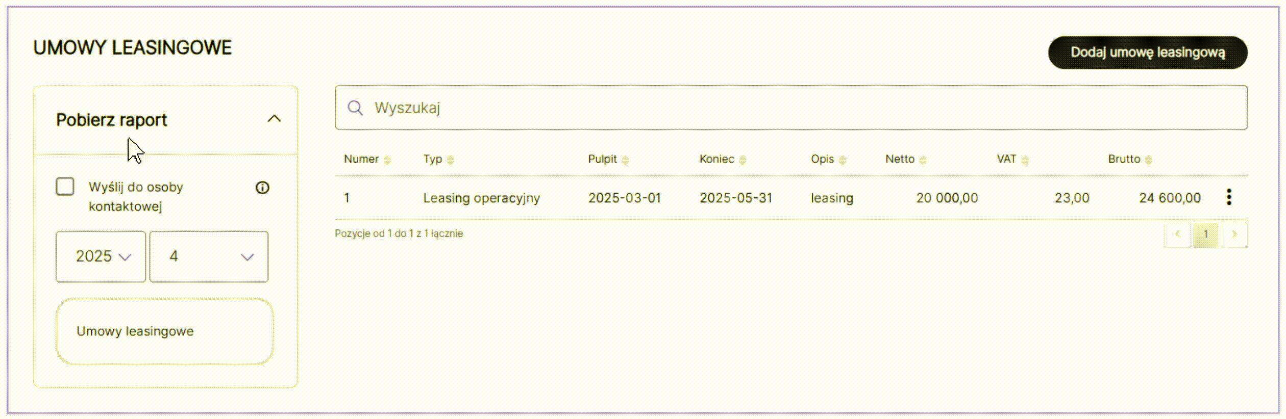 Wprowadzona umowa będzie widoczna na liście w zakładce Umowy leasingowe.