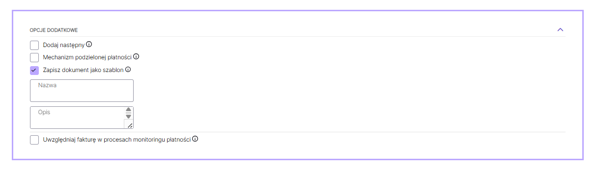 Checkbox: Zapisz dokument jako szablon z polem Nazwa i Opis: