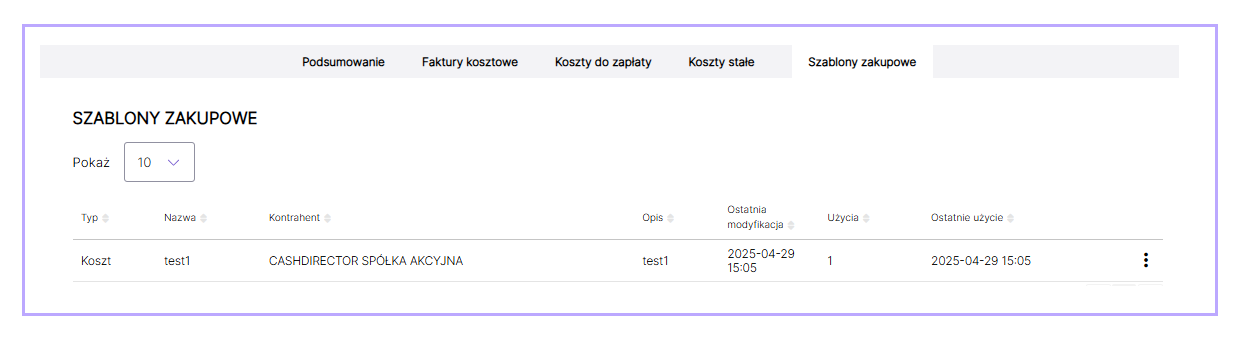 Zakładka Szablony zakupowe: