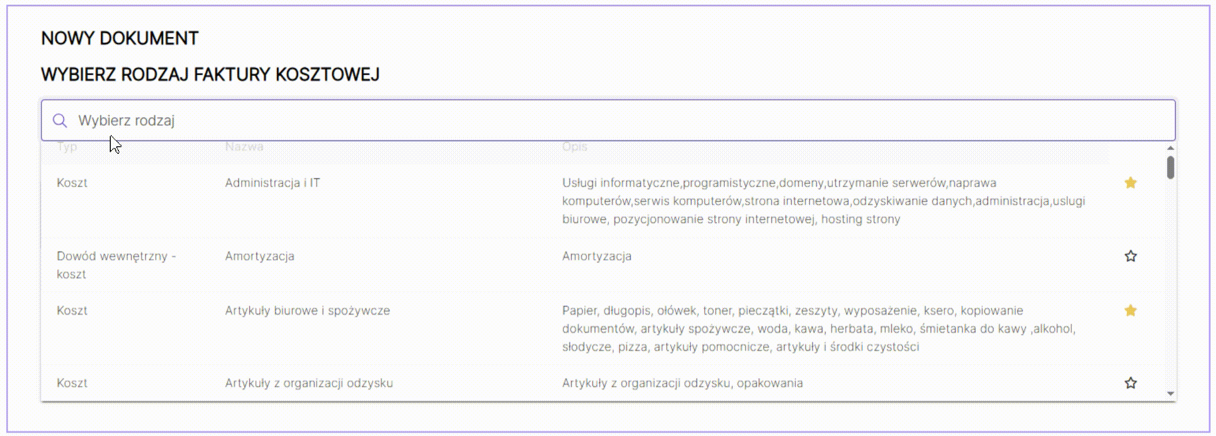 W polu Wybierz rodzaj faktury kosztowej kliknij w pole obok ikony lupy – wyświetli się lista dostępnych szablonów kosztowych: