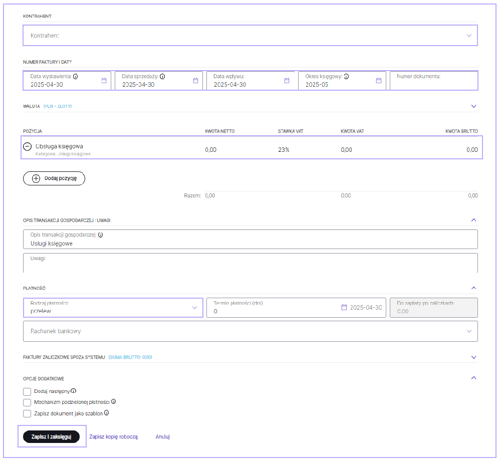 Wybierz odpowiedni szablon i uzupełnij wymagane dane zgodnie z fakturą kosztową, a następnie zatwierdź je przyciskiem Zapisz i zaksięguj: