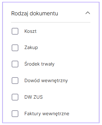 Rodzaj dokumentu – pozwala wybrać koszt, zakup, środek trwały, dowód wewnętrzny, DW ZUS lub fakturę wewnętrzną,