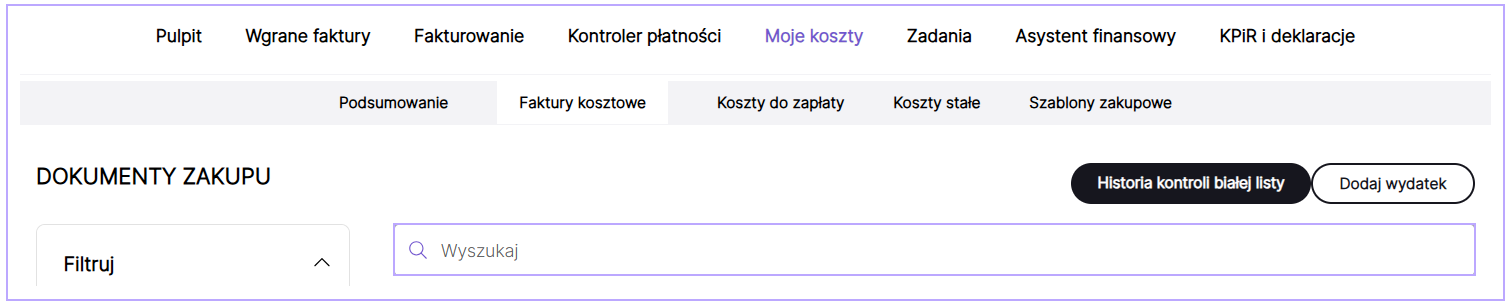 Wszystkie faktury kosztowe, które zostały wprowadzone, znajdziesz w zakładkach Moje koszty/Faktury kosztowe lub KPiR i deklaracje/Faktury kosztowe.