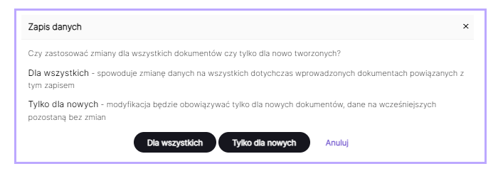 6. Wybrać jeden z widocznych komunikatów: zmiana Dla wszystkich lub Tylko dla nowych dokumentów.
