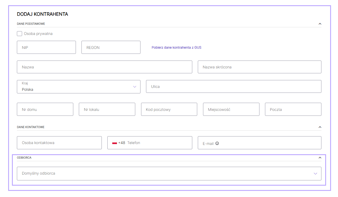 Przydzielenie właściwego odbiorcy możliwe jest również na profilu kontrahenta. W pierwszym kroku należy wprowadzić do systemu odbiorcę, a następnie wybrać kontrahenta, który będzie nabywcą i dokonać jego edycji. W polu Odbiorca wybieramy właściwy podmiot z listy: