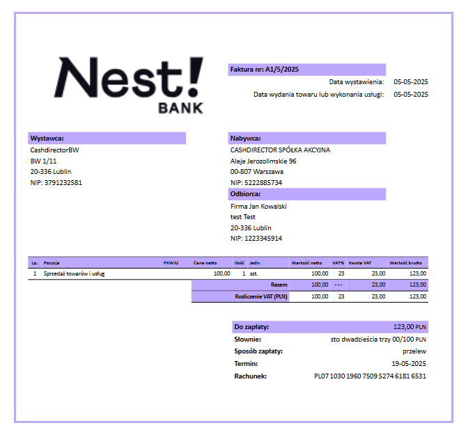Po zapisaniu zmian na wydruku faktury pojawi się zarówno Nabywca, jak i Odbiorca:
