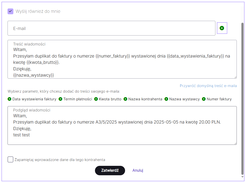Podczas pierwszej wysyłki zbiorczej System zapisze wszystkie adresy e-mail wprowadzone dla danego kontrahenta. Przy kolejnej wysyłce adresy zostaną automatycznie uzupełnione, jeśli zaznaczysz checkbox Zapamiętaj dane dla tego Kontrahenta.