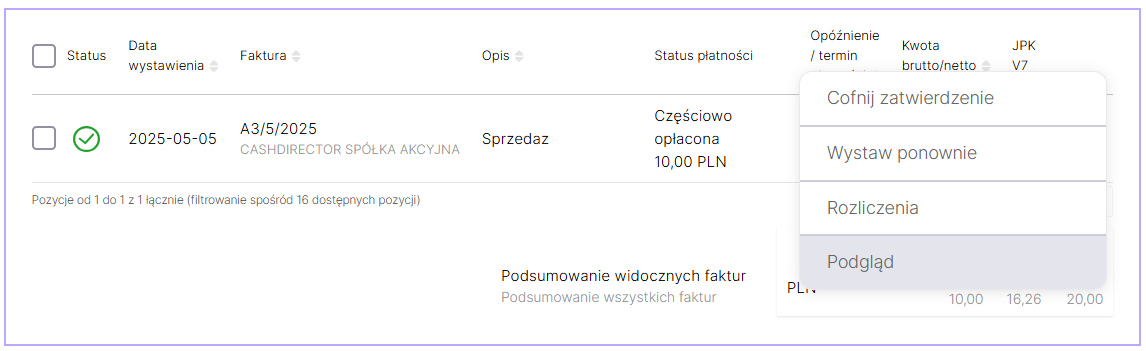 W Systemie możesz podejrzeć wcześniej wygenerowane dokumenty w formacie PDF bez konieczności ich pobierania. Aby zobaczyć podgląd faktur sprzedażowych, kosztowych lub deklaracji, najedź kursorem na trzy kropki przy wybranym pliku i kliknij przycisk Podgląd. Otworzy się nowe okno, w którym zostanie wyświetlony dokument.