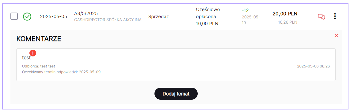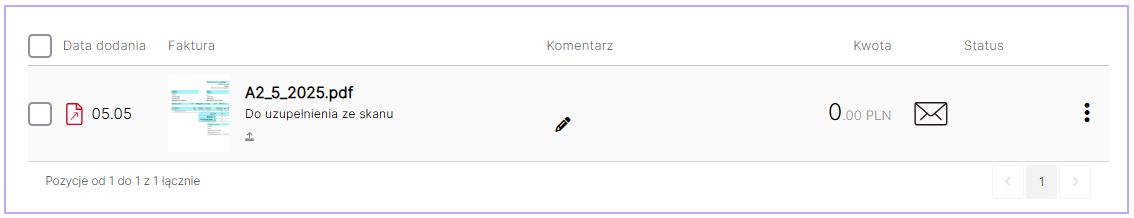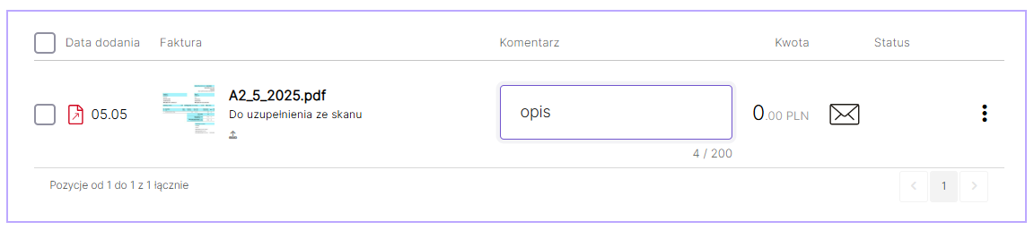 Dodany komentarz będzie widoczny przy fakturze na liście faktur