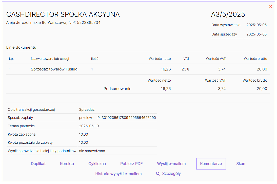 Dodanie komentarza przy fakturze sprzedaży