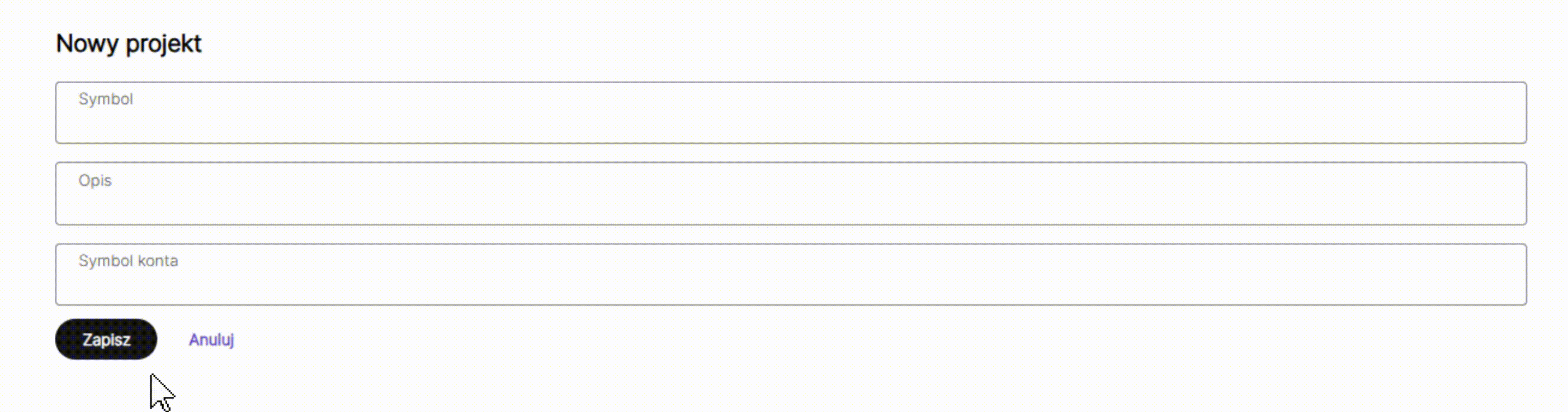 - Symbol konta (po kliknięciu w pole automatycznie otworzy się lista z planem kont, z którego należy wybrać to, które będzie przypisane do danego projektu)