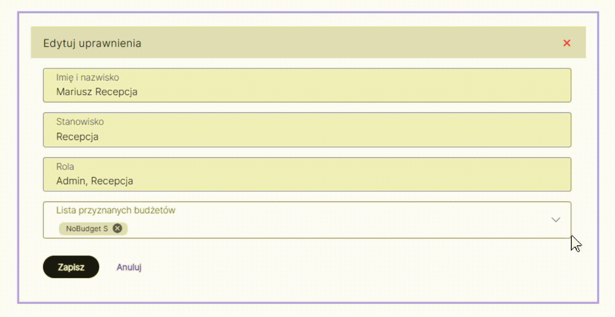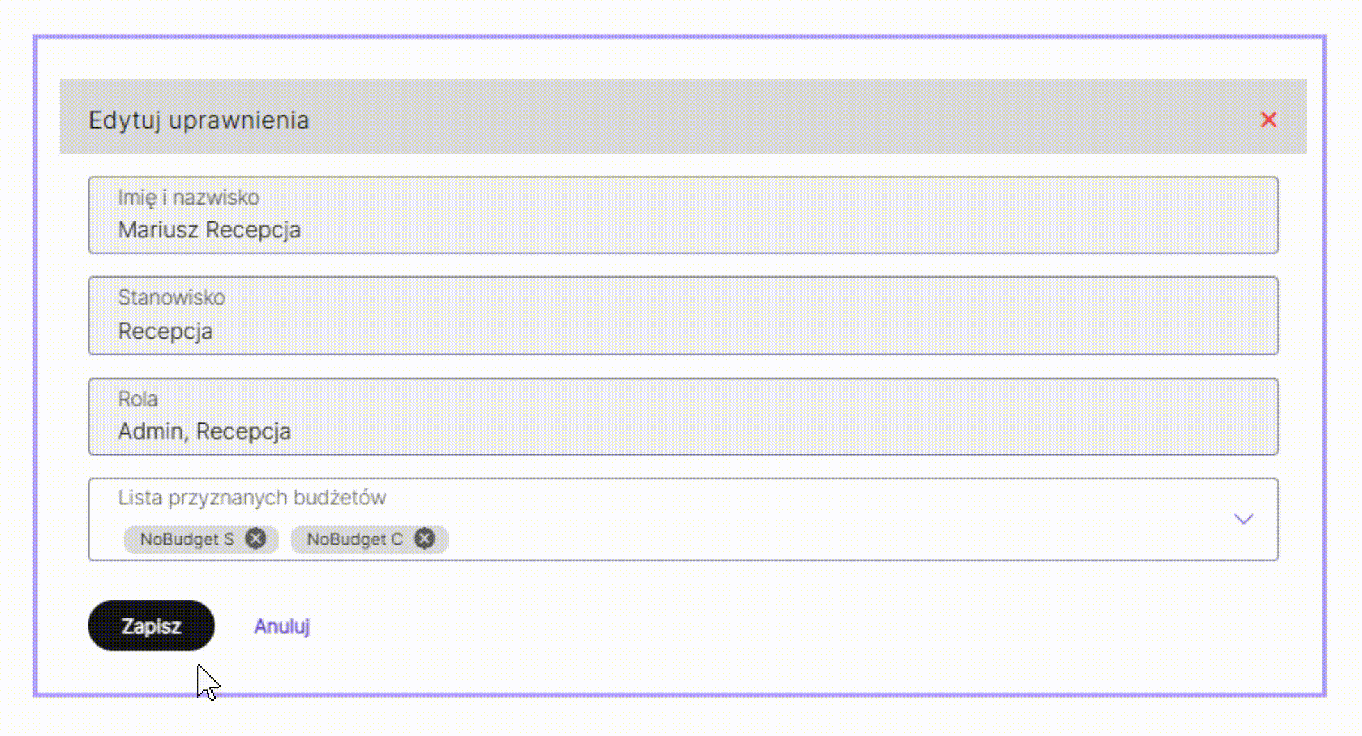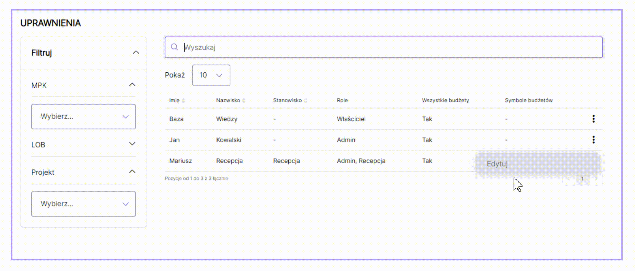 W zakładce Uprawnienia widoczni są wszyscy Użytkownicy wraz z informacją, do jakich budżetów mają dostęp. Aby poszerzyć lub zawęzić dostęp należy nakierować kursorem na wers i wybrać przycisk Edytuj.