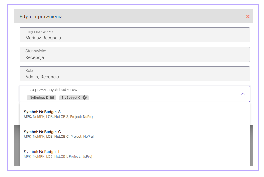 W celu dodania dostępu do kolejnego budżetu należy kliknąć w polu Lista przyznanych budżetów i wybrać budżet z rozwijalnej listy.