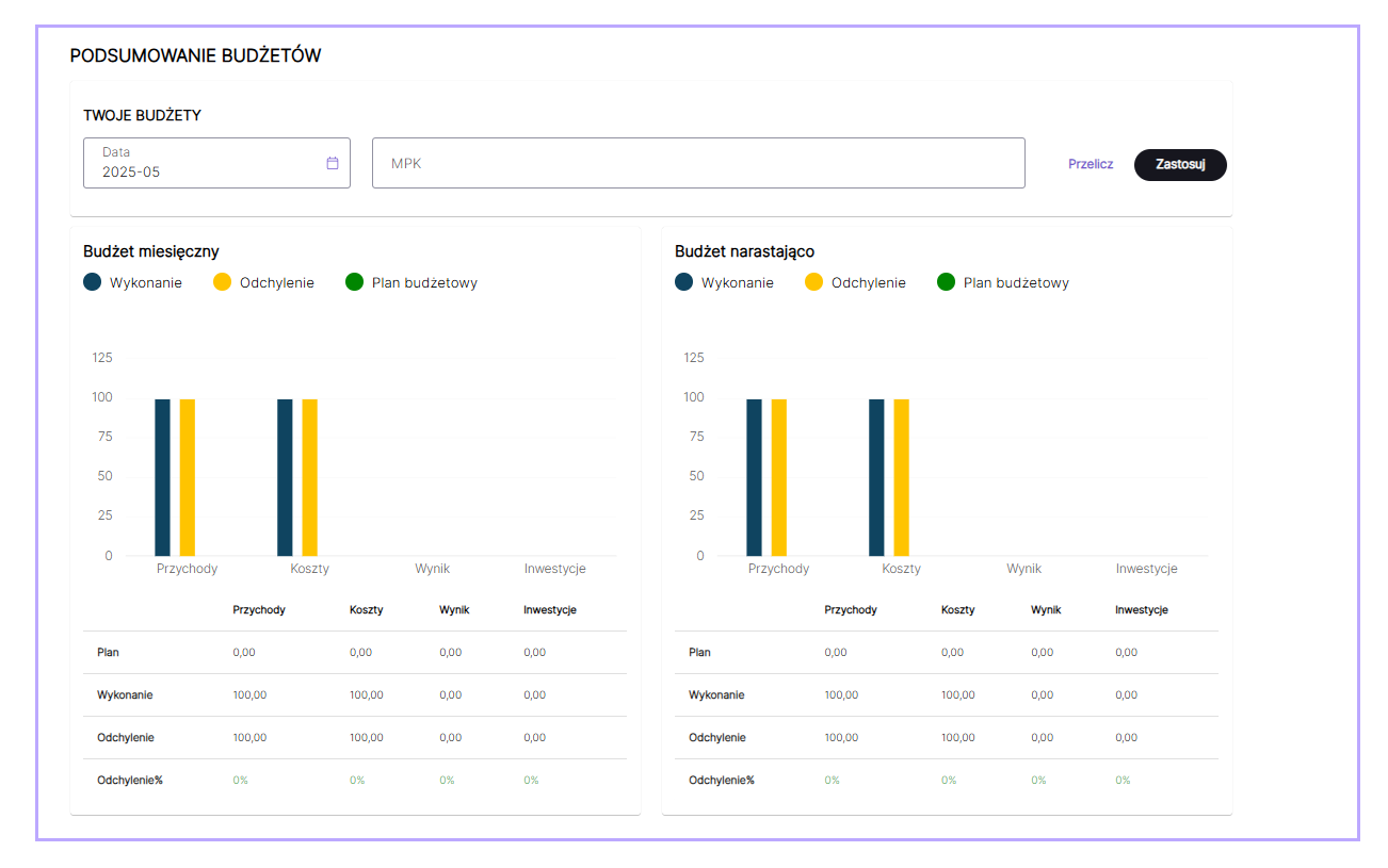 W zakładce Podsumowanie Budżetów widoczne jest graficzne zestawienie planowanych, wykonanych przychodów i kosztów pod kątem miesięcznym oraz narastająco w danym roku.