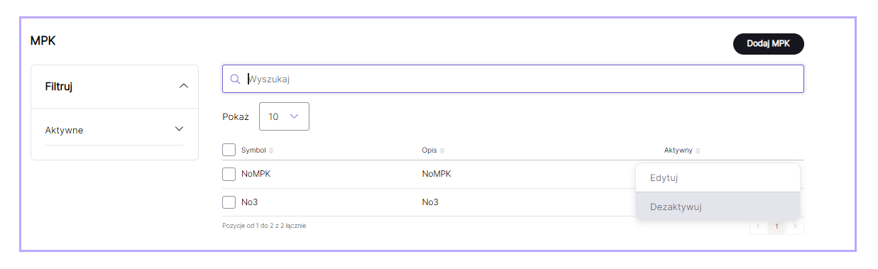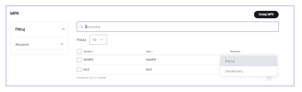 Wcześniej dodany MPK w zakładce Kontrola kosztów/Lista MPK można edytować. Poprzez nakierowanie kursora myszki na konkretny numer i wybranie przycisku Edytuj