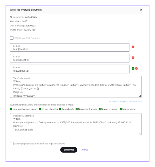 - Dodano możliwość automatycznej wysyłki faktury cyklicznej na kilka adresów e-mail – użytkownik może zapisać w ustawieniach kontrahenta listę adresów, na które faktura będzie wysyłana.