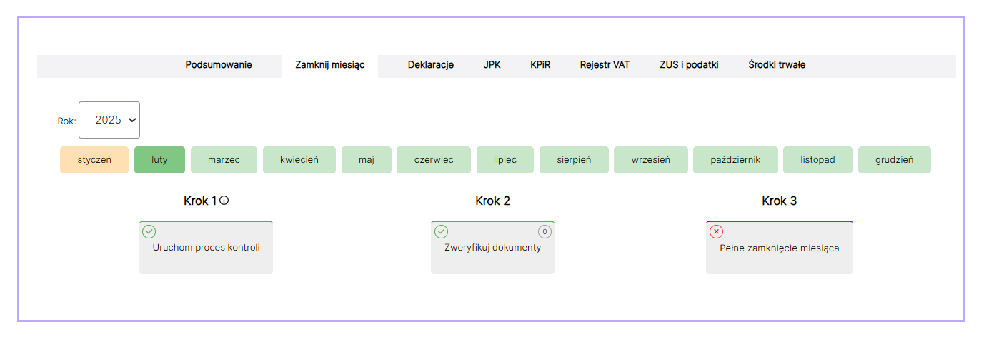 - Zmieniono kolejność kroków przy zamykaniu miesiąca – teraz najpierw wykonywany jest proces kontroli, a dopiero później weryfikacja dokumentów, co ułatwia wykrywanie błędów wcześniej w procesie.