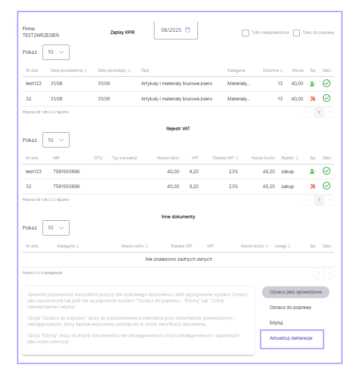 - Dodano akcję „Aktualizuj deklaracje” w kroku drugim – pozwala na szybkie przeliczenie i zaktualizowanie deklaracji bez konieczności wychodzenia z procesu zamykania miesiąca.