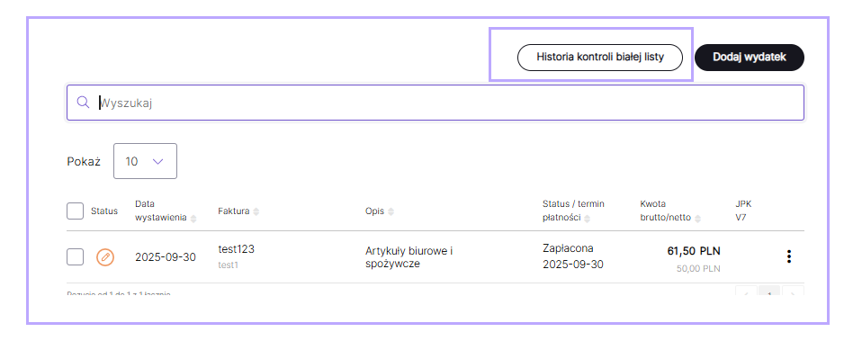 W celu zweryfikowania historii sprawdzenia wybierz przycisk Historia kontroli białej listy w zakładce Moje Koszty/Faktury kosztowe.