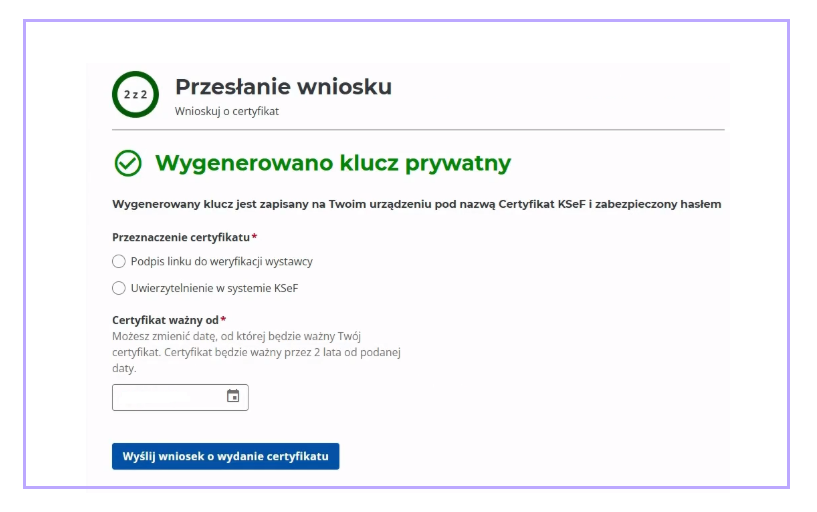 Na ekranie pojawi się Przesłanie wniosku. Należy wygenerować dwa certyfikaty. W pierwszej kolejności w sekcji Przeznaczenie certyfikatu, wybierz opcję Uwierzytelnienie w systemie KSeF - dla faktur wysyłanych w trybie online.