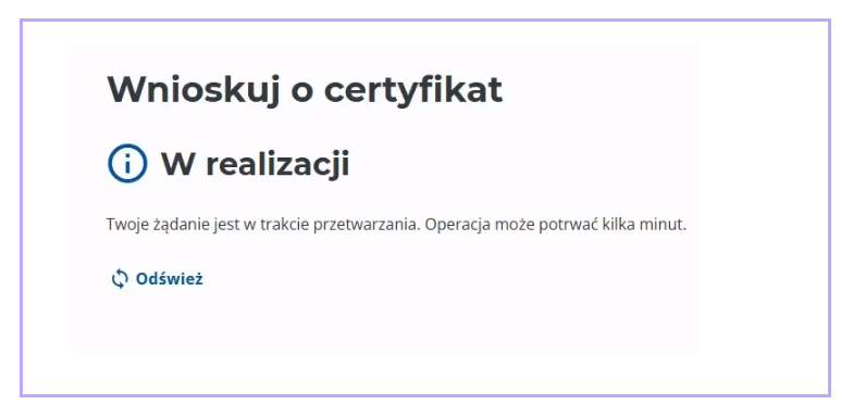 Po wypełnieniu kliknij Wyślij wniosek o wydanie certyfikatu — uruchomi to proces wydawania certyfikatu KSeF. Proces może potrwać kilka minut. Możesz użyć przycisku Odśwież, aby sprawdzić status.