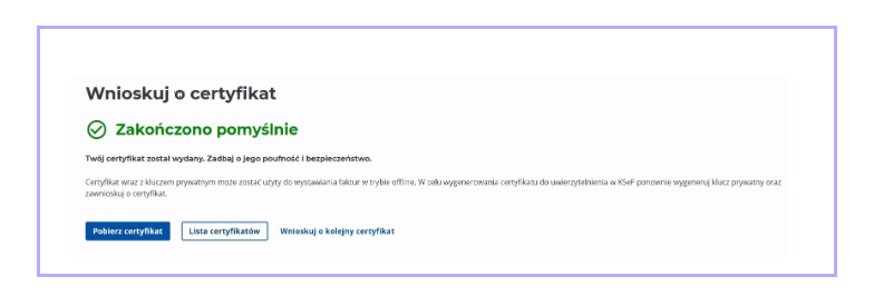 Po poprawnym wydaniu certyfikatu pojawi się komunikat o zakończeniu procesu. Masz wtedy trzy możliwości: