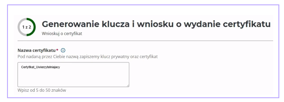 W polu Nazwa certyfikatu wpisz nazwę, pod którą zostaną zapisane: klucz prywatny i certyfikat. Nazwa będzie widoczna przy wyszukiwaniu certyfikatu oraz podczas zapisu pliku.