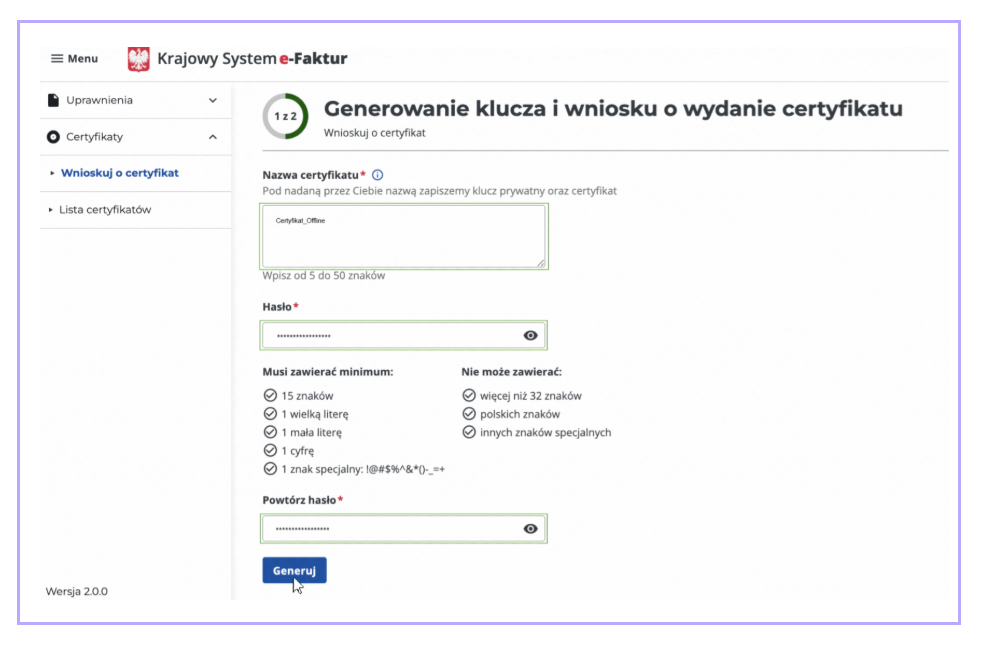 Wypełnij dane certyfikatu. Wymagane jest wprowadzenie Nazwy certyfikatu oraz utworzenie Hasła, które będzie zabezpieczać klucz prywatny oraz Powtórz hasło. Wybierz opcję Generuj. Klucz prywatny zostanie automatycznie zapisany na Twoim urządzeniu jako plik z rozszerzeniem .key.