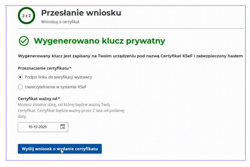 Na ekranie pojawi się Przesłanie wniosku. Należy wygenerować dwa certyfikaty. W sekcji Przeznaczenie certyfikatu, wybierz opcję Podpis linku we weryfikacji wystawcy - dla faktur wysyłanych w trybie offline.