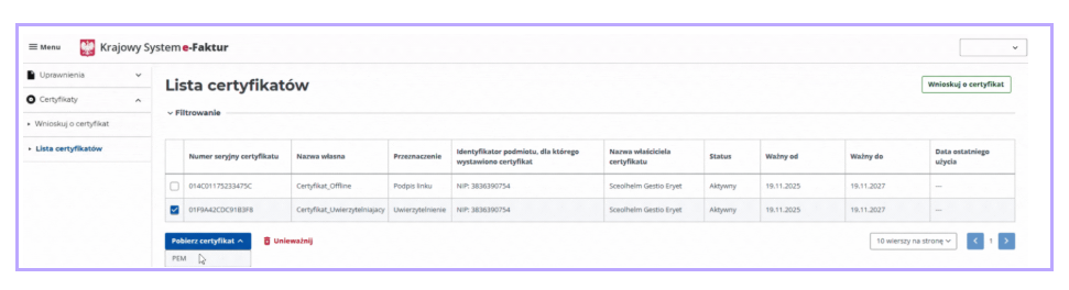 Certyfikaty można pobierać tylko, gdy mają status Aktywny (wydany i ważny). Zaznacz checkbox przy certyfikacie (możesz pobrać 1 – 10 certyfikatów jednocześnie). Przy większej liczbie użyj filtrów, aby zawęzić listę. Po zaznaczeniu co najmniej jednego certyfikatu przycisk Pobierz certyfikat stanie się aktywny - wybierz format PEM.