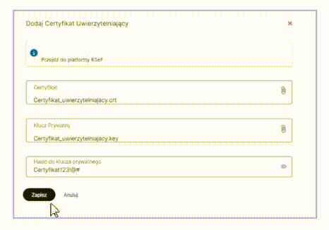 Wgraj certyfikat w formacie .crt, który został wygenerowany w Aplikacji Podatnika KSeF 2.0. z przeznaczeniem certyfikatu do Uwierzytelnienia w systemie KSeF. Załącz klucz prywatny w formacie .key. Wprowadź również Hasło do klucza prywatnego, które zostało zdefiniowane podczas generowania certyfikatu oraz zapisz zmiany.