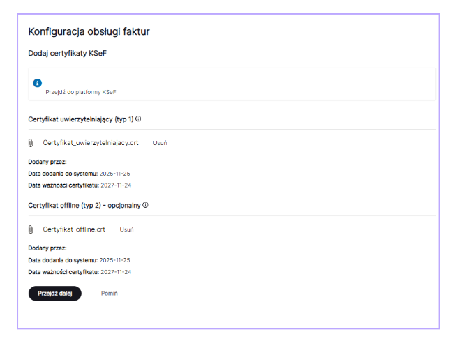 Uwaga: Jeżeli jesteś administratorem i chcesz wystawiać lub pobierać faktury z KSeF musisz nadać uprawnienia samemu sobie.10. Wgranie certyfikatów do systemu