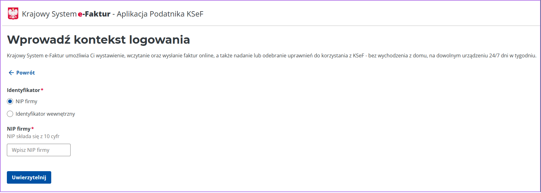 Następnie wprowadź kontekst logowania - podaj numer NIP swojej firmy i kliknij Uwierzytelnij.
