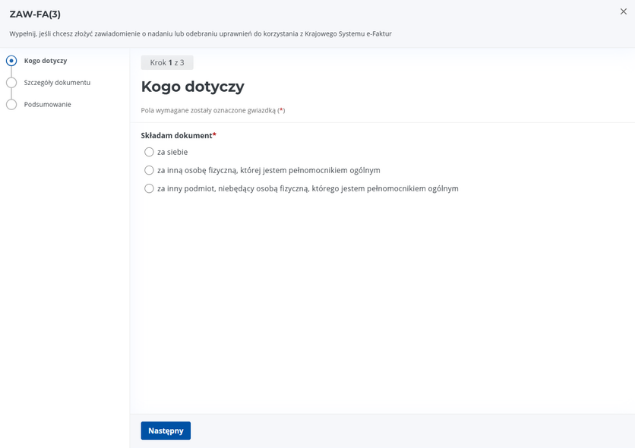 W pierwszym kroku wybierz, czy składasz zawiadomienie: