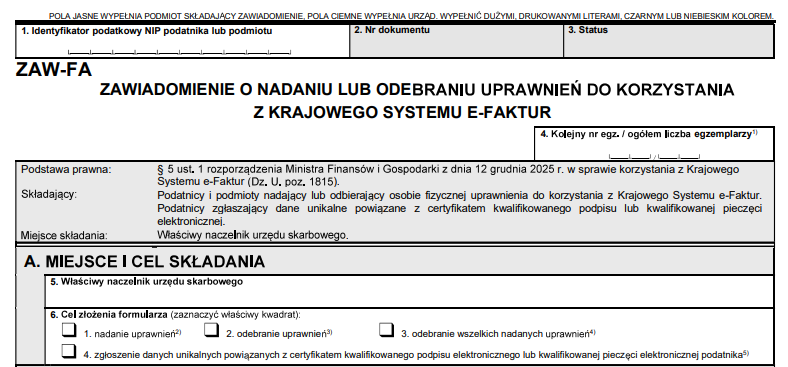 Zawiadomienie ZAW-FA to formularz składany do właściwego naczelnika urzędu skarbowego informujący o nadaniu lub odebraniu uprawnień do korzystania z Krajowego Systemu e-Faktur w imieniu spółki.