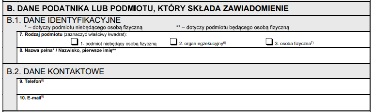 - B.1. Dane identyfikacyjne - wskaż dane identyfikacyjne podatnika lub podmiotu,