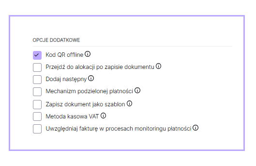 Do szablonów faktur sprzedażowych i kosztowych oraz do ręcznych wpisów w sekcji Opcje dodatkowe dodano parametr Kod QR offline.