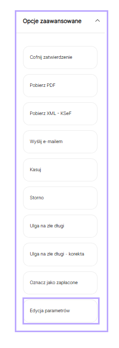 W sekcji Opcje zaawansowane na liście faktur zmieniono nazwę parametru Edycja parametrów JPK V7 na Edycja parametrów.